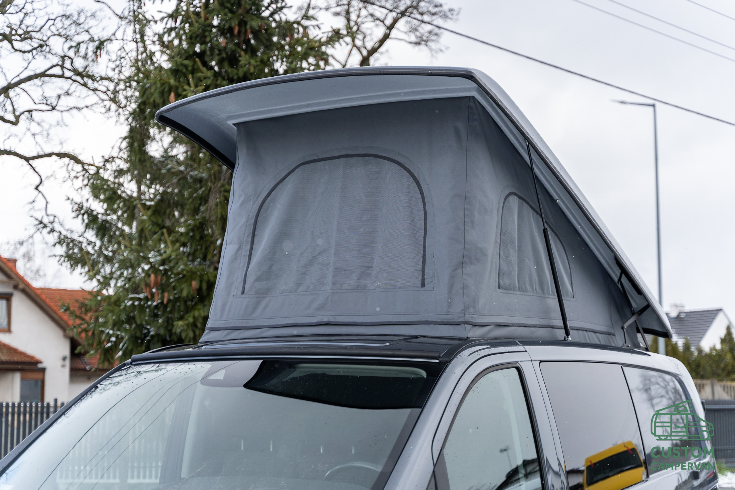 Dach sypialny na Mercedesie Vito Extra Long. Założony dach z wersji long idealnie pasuje do nadwozia samochodu. Dodatkowo dach sypialny został pomalowany przed montażem na wskazany kolor dzięki czemu stanowi jednolitą i spójną konstrukcję z całym autem. Namiot w wersji sky open daje dodatkową możliwość panoramicznego otworzenia co zapewnia więcej przestrzeni oraz możliwość nieograniczonych widoków z pozycji łóżka sypialnego na dachu.